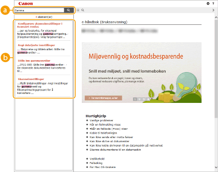 Viser søkeresultatene for sidene som inneholder de angitte nøkkelordene. Fra resultatene, kan du finne siden du ser etter og klikke på emnetittelen på siden.