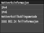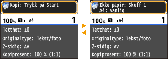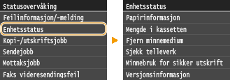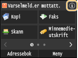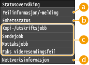 , vises et skjermbilde som lar deg sjekke fremdriften for dokumenter som skrives ut, sendes eller mottas, samt statusen til maskinen (gjenværende toner osv.) og nettverksinnstillingene som for eksempel maskinens IP-adresse.