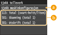 ) vises <Sjekk telleverk>-skjermen. Fra dette skjermbildet kan du vise televerdier for utskrifter i tillegg til serienummeret på maskinen og maskinkonfigurasjonen.