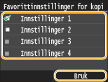 Kryss av i avmerkingsboksen for alle innstillingene som skal vises på Hjem-skjermen og trykk på <Bruk>.