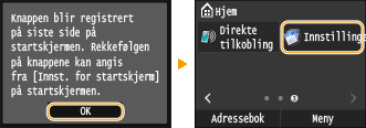Hvis du velger <Ja>, vises en melding. Sjekk meldingen og trykk deretter på <OK>. Den registrerte innstillingskombinasjonen legges til Hjem-skjermbildet som en snarveisknapp.