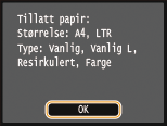 Kontroller at papirformatet og -typen som vises er lagt inn i maskinen, og trykk på <OK>.