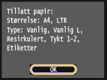 Kontroller at papirformatet og -typen som vises på skjermen, er lagt inn i maskinen, og trykk på <OK>.