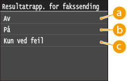 Når du velger <På> eller <Kun ved feil>, kan en del av et faksdokument inkluderes i rapporten. Angi <Inkluder sendebilde> til <På>.