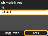 Hvis PIN-koden for adresseboken er angitt, vises <Adressebok-PIN>-skjermbildet under importen. Tast inn PIN-koden for adresseboken og trykk på <Bruk>. Trykk på <Hopp over> for å avbryte importen av adressebokdata.