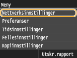 Alle innstillingene om nettverket er oppført med korte beskrivelser. Standardinnstillinger er merket med en dolk (