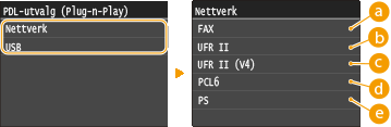 Velg et sidebeskrivelsesspråk, slik at maskinen registreres som en skriver som er kompatibel med dette språket, når den kobles til en datamaskin ved hjelp av Plug-n-Play.