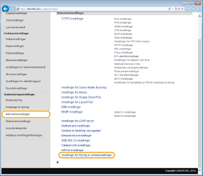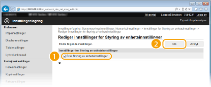 Bruk av iW Management Console-pluginsDu må aktivere innstillingene for den dedikerte porten og SNMP-innstillingene. Som for SNMP-innstillingene, settes [MIB-tilgangstillatelse] til [Lese/skrive] for både SNMPv1 og SNMPv3.