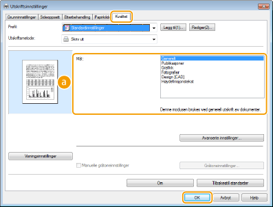 Velg et alternativ som passer dokumenttypen eller formålet med utskriften. Velg for eksempel [Generelt] for generelt bruk, eller velg [Fotografier] når du vil skrive ut fotografier i optimal utskriftskvalitet.