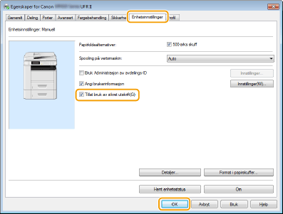 Klikk på [Enhetsinnstillinger]-fanen og se til at [Tillat bruk av sikret utskrift]-boksen er krysset av.