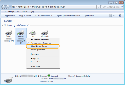 Høyreklikk på skriverdriverikonet for denne maskinen og klikk på [Utskriftsinnstillinger].