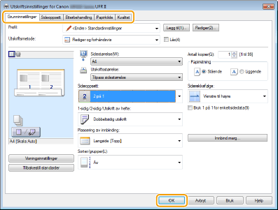 Klikk på fanen [Grunninnstillinger], [Sideoppsett], [Etterbehandling], [Papirkilde] eller [Kvalitet] for å spesifisere utskriftsinnstillingene i hvert skjermbilde etter behov.