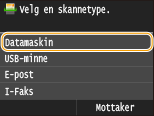 Det å skanne et dokument og lagre det på en datamaskin kan bare gjøres når du skanner fra maskinen. Du skanner mens du angir hvilken datamaskin dokumentene skal lagres på, om dokumentene skal skannes i farger eller svart/hvitt, om dokumentene skal lagres som PDF- eller JPEG-filer, og andre innstillinger.