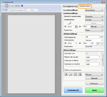 Hvis du klikker på kategorien [Avansert modus] på ScanGear MF-skjermen, kan du foreta mer avanserte justeringer i bildekvaliteten enn i Enkel modus. Du kan også registrere justerte innstillinger som favorittinnstillinger. Hvis du vil ha mer detaljert informasjon, klikker du på ikonet