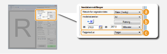 Angi inndatametoden for dokumentet (glassplaten eller materen), dokumentstørrelsen, fargemodusen og andre innstillinger.