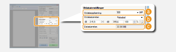 Viser datastørrelsen til bildet når det skannes med verdiene som er angitt for [Utdataoppløsning] og [Utdatastørrelse].