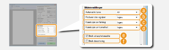 Konfigurer innstillinger for å forbedre bildekvaliteten, for eksempel korrigering av riper eller falmede farger på et fotografi. Disse innstillingene er tilgjengelige hvis du velger [Farger] eller [Gråtoner] for [Fargemodus] (