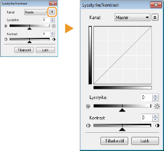 Justerer lysstyrken og kontrasten (forskjellen mellom de lyse og mørke delene) i bildet. Hvis du vil justere mens du kontrollerer på en graf, klikker du på