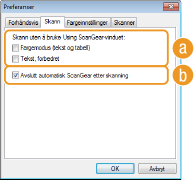 Skjermbildet [ScanGear MF] lukkes automatisk etter at skanningen er fullført. Skjermbildet kan lukkes automatisk i enkelte programmer, uavhengig av denne innstillingen.