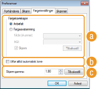 Dersom programinnstillingene er spesifisert til skanning av dokumenter i farge, erstattes disse innstillingene og dokumenter skannes med ScanGear MF-fargemodus stilt inn til [Fargemodus (tekst og tabell)].