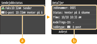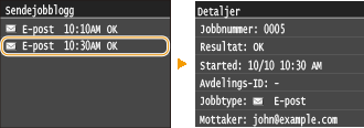 ![]() <Sendejobblogg>Viser en liste over dokumentene som er sendt. <OK> vises når et dokument ble sendt uten problemer, og <Feil> vises når et dokument ikke kunne sendes fordi det ble kansellert eller det oppstod en feil.