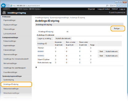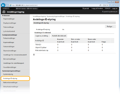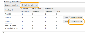 Hvis du vil stille tellerne tilbake til null, klikker du på den tilsvarende tekstkoblingen under [Avdelings-ID] og klikker deretter på [Nullstill telleverk]