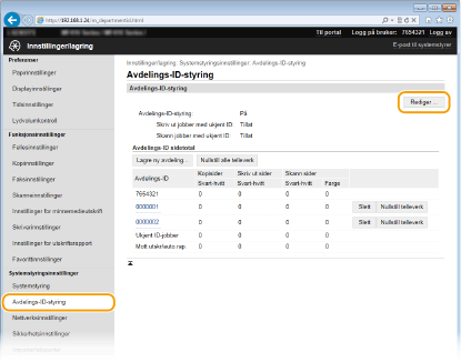 Redigere innstillingene for den registrerte avdelings-ID-en|