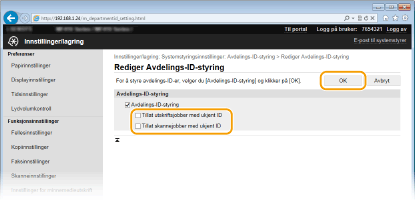 Klikk for å verifisere at riktig ID og PIN-kode er tastet inn. Denne funksjonen er ikke tilgjengelig hvis maskinen og datamaskinen er koblet til via en USB-port eller en WSD-port (Web Services on Devices). [Bekreft avdelings-ID/PIN-kode ved utskrift]/[Bekreft avdelings-ID/PIN-kode ved sending av fakser]