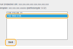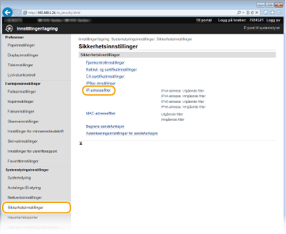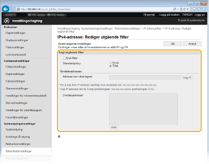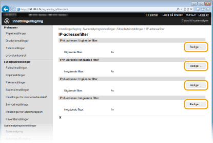 Hvis IP-adresser blir angitt feil, kan det hende at du ikke får tilgang til maskinen fra Fjernkontroll. I så fall må du angi <IPv4-adressefilter> eller <IPv6-adressefilter> til <Av>.