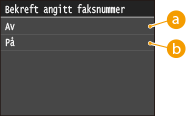 Du kan stille inn maskinen til å be brukere om å taste inn faksnummeret to ganger når det tastes inn med talltastene. På denne måten kan du redusere risikoen ved å fakse til feil nummer på grunn av inntastingsfeil.
