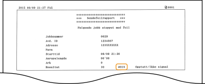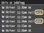 Hvis det oppstår en feil som når utskriften mislyktes eller når du ikke kan sende eller motta en faks eller skannet dokument, vises den tilhørende feilkoden i en rapport eller på skjermbildet <Jobblogg>, som et tresifret tall. Kontroller følgende for å finne ut årsaker og løsninger for hver feilkode. For hvordan du skriver ut en feilrapport og informasjonen i rapporten, se