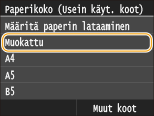 Kun oletuspaperiasetus on tallennettu, paperiasetusnäyttöä ei näytetä, kun paperia lisätään, ja samaa asetusta käytetään aina. Jos lisäät erilaista paperikokoa tai -tyyppiä vaihtamatta paperiasetuksia, laite ei ehkä tulosta oikein. Voit välttää tämän ongelman valitsemalla <Määritä paperin lataaminen> vaiheessa 3 ja lisäämällä sitten paperin.