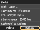 -näytöstä <Faksiasetukset>. Kohdassa <Osoitekirja> tehdyt asetukset ovat kuitenkin käytettävissä osoitekirjaan tallennettujen vastaanottajien tarkkoja asetuksia varten. |