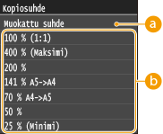 Voit suurentaa tai pienentää kopioita käyttämällä ennalta asetettu kopiointisuhdetta, kuten <A5->A4> tai määrittämällä mukautetun kopiointisuhteen 1 % tarkkuudella.