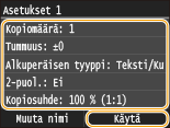 Voit tallentaa enintään neljä usein käytettyä kopiointiasetusten yhdistelmää. Valitsemalla tallennetun yhdistelmän tarvittaessa sinun ei tarvitse määrittää samoja asetuksia joka kerran, kun kopioit. Jos esimerkiksi asetat usein kopiomääräksi 5, aseta <Kehyksen poisto>-asetukseksi <Kyllä>, ja lisää terävyyttä kopioitaessa. Voit myös näyttää asetukset pikavalintapainikkeina Koti-näytössä.