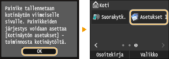 Jos valitset <Kyllä>, näyttöön tulee viesti. Tarkista viesti ja napauta <OK>. Tallennettu asetusyhdistelmä lisätään Koti -näyttöön pikavalintapainikkeeksi.