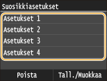 Jos haluat poistaa tallennetun asetuksen, napauta <Kopiointi>  <Suosikkiasetukset>  <Poista>  Valitse asetukset  <Kyllä>  <Kyllä>.