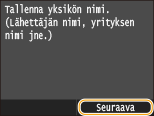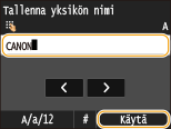 Syötä yksikön nimi (esimerkiksi käyttäjän tai yrityksen nimi) numeronäppäimillä ja napauta <Käytä>.