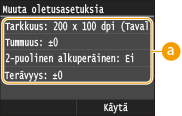 Oletusasetukset ovat asetuksia, jotka näytetään aina, kun kytket laitteeseen virran tai painat