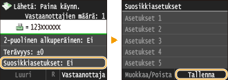 Jos haluat muokata tai poistaa tallennettuja asetuksia, siirry kohtaan <Faksi>  <Suosikkiasetukset>  <Muokkaa/Poista>  <Muokkaa> tai <Poista> ja noudata alla olevia ohjeita.