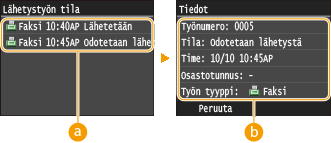 ![]() <Lähetystyön tila>/<Vastaanottotyön tila>Näyttää luettelon kaikista asiakirjoista, joita lähetetään tai vastaanotetaan tai jotka odottavat käsittelyä.