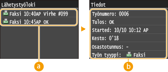 ![]() <Lähetystyöloki>/<Vastaanottotyöloki>Näyttää luettelon lähetetyistä ja vastaanotetuista asiakirjoista. <OK> näytetään, kun asiakirjan lähetys tai vastaanotto onnistui, ja <Virhe>, kun asiakirjan lähetys tai vastaanotto epäonnistui, koska se peruutettiin tai tapahtui virhe.
