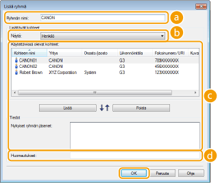Valitse ryhmävalintaan tallennettavat vastaanottajat ja valitse [Lisää]. Valitut vastaanottajat näytetään kohdassa [Nykyiset ryhmän jäsenet].