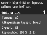 Jos laite vastaanottaa fakseja tai automaattinen raporttien tulostus on määritetty, vastaanotetut faksit ja raportit tallennetaan laitteeseen, etteivät ne tulostuisi haaleina. Jos haluat jatkaa tulostusta, vaikka kasetissa jäljellä oleva väriaine on vähissä, vaihda <Jatka tulostusta kun kasetin väri on vähissä> asetukseen <Kyllä>. Jatka tulostusta kun kasetin väri on vähissä