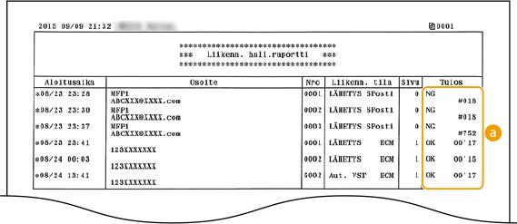 Kun virhekoodi näytetään). Sähköpostiviesteille liikennöinnin hallintaraportti ilmoittaa lähetystuloksen laitteen ja sähköpostipalvelimen välillä, ei laitteen ja vastaanottajan välillä.