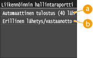 Voit tarkistaa lähetettyjen ja vastaanotettujen faksi- ja sähköpostiasiakirjojen lokit tulostamalla liikennöinnin hallintaraportin. Raportti voidaan tulostaa automaattisesti aina 40 tapahtuman jälkeen tai voit tulostaa sen manuaalisesti.