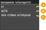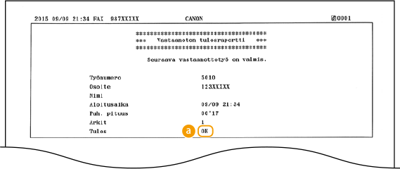 Voit tarkistaa vastaanotettujen faksi- tai I-faksiasiakirjojen lokit tulostamalla vastaanoton tulosraportin. Raportti voidaan tulostaa joko aina, kun lähetys on valmis, tai vain, jos tapahtuu vastaanottovirhe.