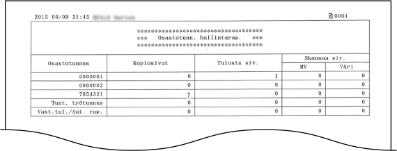 Kun osastotunnusten hallinta on käytössä, voit tarkistaa tulosteiden kokonaismäärät per <Osastotunnus> tulostamalla osastotunnusten hallintaraportin. Tarkistamalla tulosteiden kokonaismäärät voit paremmin hallita paperien ja väriainekasettien varastoja.
