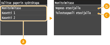 Kaikki paperikasetin toimintaa ja paperinsyöttötapaa koskevat asetukset ja lyhyet kuvaukset näytetään. Oletusasetukset on merkitty tikarilla (
