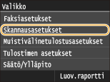 Kaikki skannauksen asetukset ja lyhyet kuvaukset luetellaan. Oletusasetukset on merkitty tikarilla (
